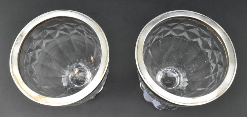 A pair of early 19th century cut glass and silver plated condiment pots. Each with silver plated circular lid with knob finial, over diamond cut body into tapered fluted design. Raised over floral shaped foot. One foot ground down.