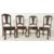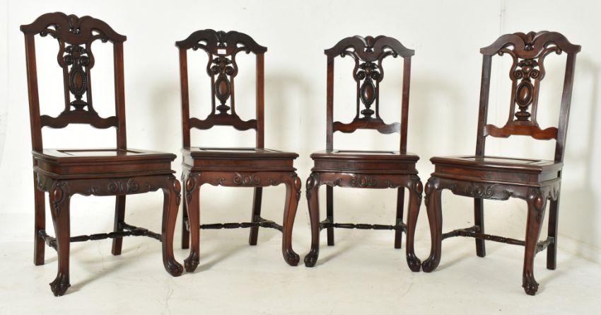 A French continental early 20th century carved oak extending dining table together with a set of four chairs. The table having a squared chamfered edge top over five reeded turned flared supports with side carved panels. No leaf present. The set of four 20th century hardwood dining chairs having flip over panel seats. Each chair having a scrolled top with central carved back splat flanked by straight supports. Shaped seat having a central panel turning with paneled seat on one side and cushioned upholstered seat on the other. All raised on carved supports with ball & claw feet united by H shaped block and turned stretcher.