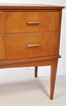 British Modern Design - A mid 20th-century retro teak sideboard credenza. The sideboard with a rectangular top having six drawers, each with a metal handle and raised on four tapering legs. Measuring approx.
