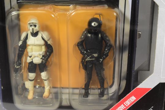 Star Wars - Commemorative Tin Collection - x4 Hasbro made four-figure action figure sets. Includes: 5/6 Snowtrooper / Luke Skywalker / Han Solo / Chewbacca, 'Exclusive Edition' Darth Vader / R5-J2 / Biker Scout / Death Star Gunner, 6/6 Scout Trooper / Darth Vader / Princess Leia / Rebel Commando and 4/6 Sandtrooper / Princess Leia / Darth Vader / C3PO. All fully factory sealed, mint. As new.