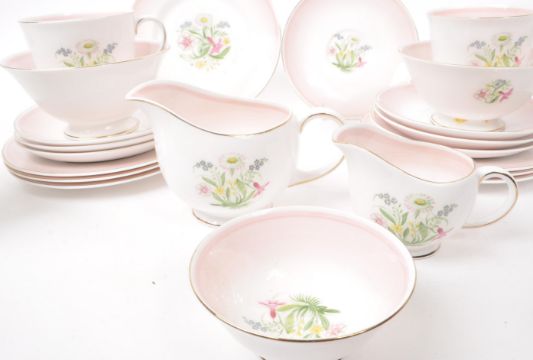 Susie Cooper - A collection of mid-century bone china tea service pieces, in 'Romance' pink. Featuring a gradient pink and white design, with floral decoration to the center of each piece. Including tea cups, saucers, sugar pots, bowls, and side plates. Makers mark printed to the bottom of each piece.