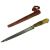 A North African ( Algeria ) Bou Saada / Saadi Khodmi knife. Carved horn grip wrapped in brass and iron trade wire with a tapering blade struck with crescent shapes. Housed in a tooled leather scabbard. Measures approx 27cm.