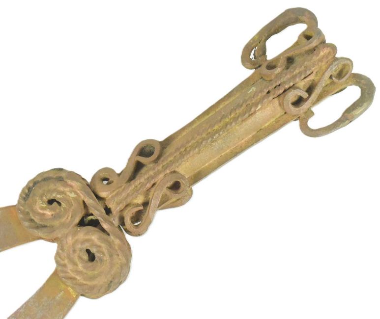 Nigerian I West African Hausa people tribal ceremonial dagger. Twin tapering crescent blades with scrollwork hilt, shaped metal handle with pierced ends. Measures approx 39cm.