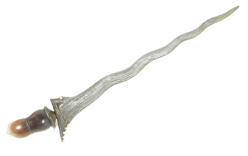 An early 20th Century Malayan Kris / Keris dagger. Hooked carved wooden grip with a typical wavy blade. Measures approx 41cm.