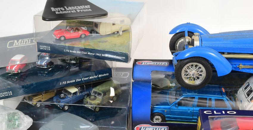 Diecast - a collection of assorted boxed and unboxed diecast models. Includes: boxed Corgi 05301 Chitty Chity Bang Bang, an unboxed vintage Chitty Chitty Bang Bang model, unboxed Models Of Yesteryear, Oxford M&S 1/76 scale boxed sets, an Only Fools & Horses Reliant Regal Supervan III keyring, and others.