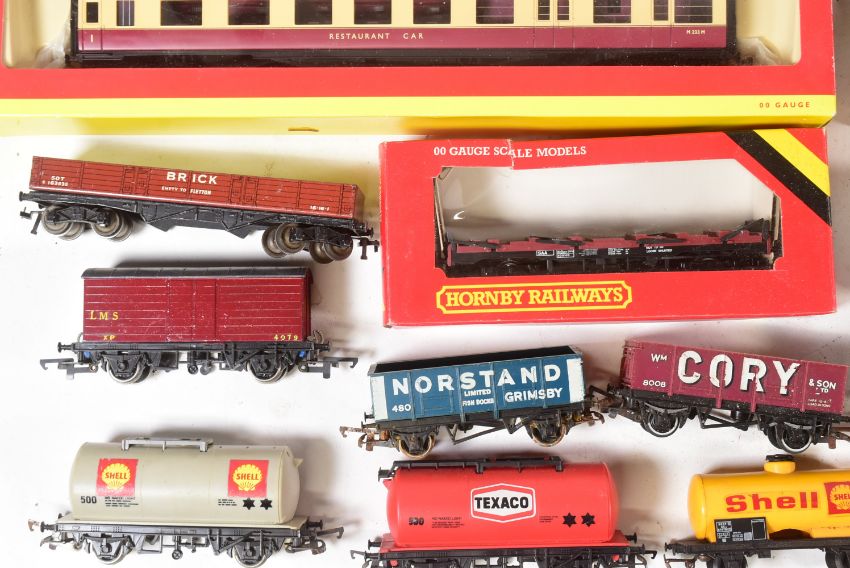 Model Railway - a collection of assorted OO gauge model railway trainset locomotive rolling stock coaches and wagons. Largely Hornby examples to include Royal Mail coach, oil tankers, coal wagons and more.