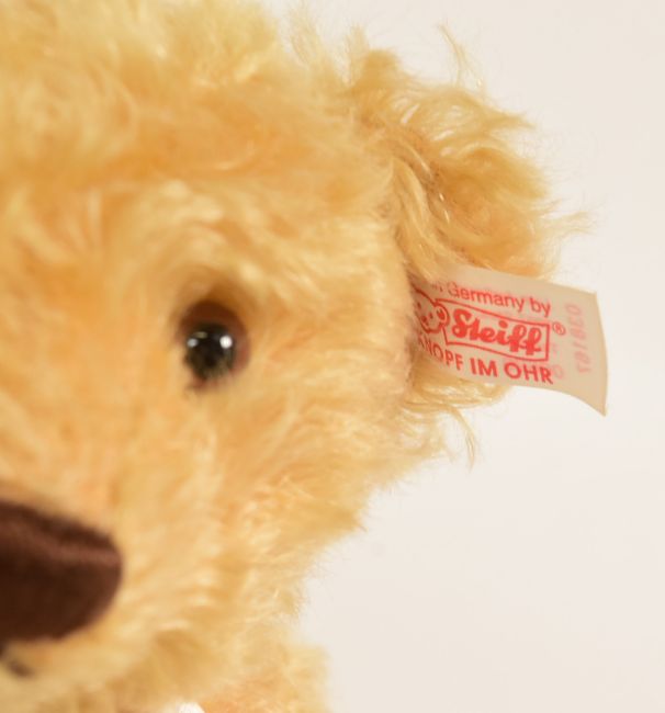 Teddy Bears - an original German Steiff ' Teddy Bear with Rackerplan '. The blonde mohair bear with a goldfish-design plane with elephant button attached to the propeller. Measures approx 28cm. Boxed with certificate.