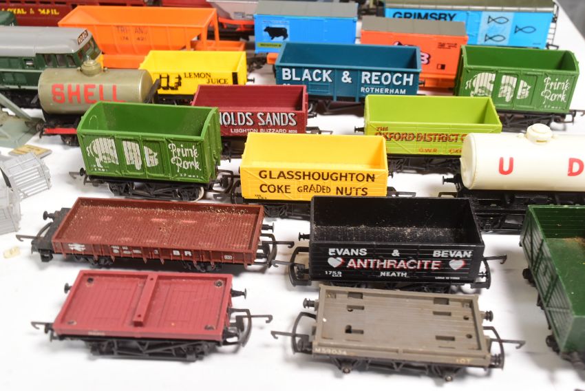Model railway - a large collection of OO Gauge engines, rolling stock and trackside accessories. Lot includes Lima / Triang / Hornby locomotives and selection of rolling stock wagons and coaches with Tri-ang NATO missile rocket launcher, oil tankers, royal mail coach, crane, hopper wagon. Trackside accessories including platform sections and bridge, buildings, trees and foliage, animals, people, signals, fencing and others. With a selection of unopened Metcalfe model card building kits plus other model card structure kits.