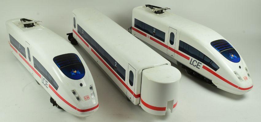 Model Railway – Lehmann 78600 ‘The Big Train’ – an original boxed G Scale Lehmann Gross Bahn LGB model railway electric powered starter set 'LCE' streamline express train. Set includes powered railcar, intermediate car and unpowered railcar. Missing track, transformer and other previously included accessories. Includes instructions manual.