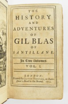 French literature:- Lesage, Alain-Rene. 1716 The History and Adventures of Gil Blas of Santillane in Two Volumes. Printed for Jacob Tonson. Contemp. full calf, gilt morocco spine labels & bands, extremities bumped, loss to the head of the spine of vol II, spines a touch dried & rubbed, armorial bookplate & contemp. ink inscription to front pastedown of each volume, pencil inscriptino to ffep, each illustrated with engraved frontispiece, light age-toning. The first translation into English of this popular picareque novel by Alain Rene Lesage. 12mo.