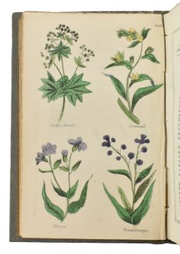 Botany. c1850 A New Family Herbal; or a History & Description of all the British and Foreign Plants which are Useful to Man, either as Food, Medicine, Farmiling Purposes or in the Arts and Manufactures, compiled from the works of Hill, Woodville, Don, Culpepper and other Botanists by Richard Brook. Sixth edition, printed W. M. Clark. Publisher's orig. decorative cloth binding with gilt spine & blind stamped detail to front board, some bumping to the head & tail of the spines, light marks to front board, extremities a touch bumped, straining to the front hinge, contemp. ownership inscription to illustrated half title. Hand coloured engraved plates depicting the flowers & plants throughout. 12mo.