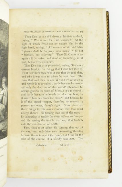 Bindings. 1796 The Pilgrim's Progress by John Bunyan, to which is Prefixed the Life of the Author with a Key to the Allergory and a Critique on its Beauties. Published by T. Heptinstall, two parts bound as one. Illustrated vignette title page, engraved frontispiece portrait of the author, seven plates besides. Full tree calf binding, gilt borders & spine, boards a touch rubbed and spine with ribbing similarly, noticeable to head & tail of the spine, marbled endpapers & gilt dentelles, 1806 inscription by a prior owner regarding the work to verso of ffep. An uncommon & charmingly illustrated edition of this work, one of the most heavily printed in history. 8vo.