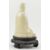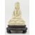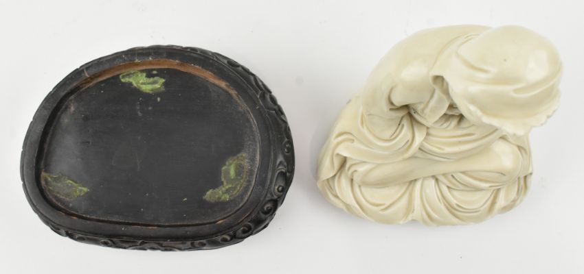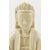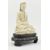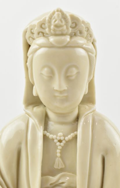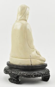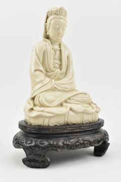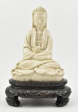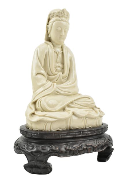 A Qing dynasty Dehua Blanc de Chine porcelain Guanyin / Buddha of Mercy, seated cross-legged on a lotus base, wearing a long flowing robe open at the chest, the face with gentle smile. Covered overall with an ivory-white glaze. The wooden stand is not included.
