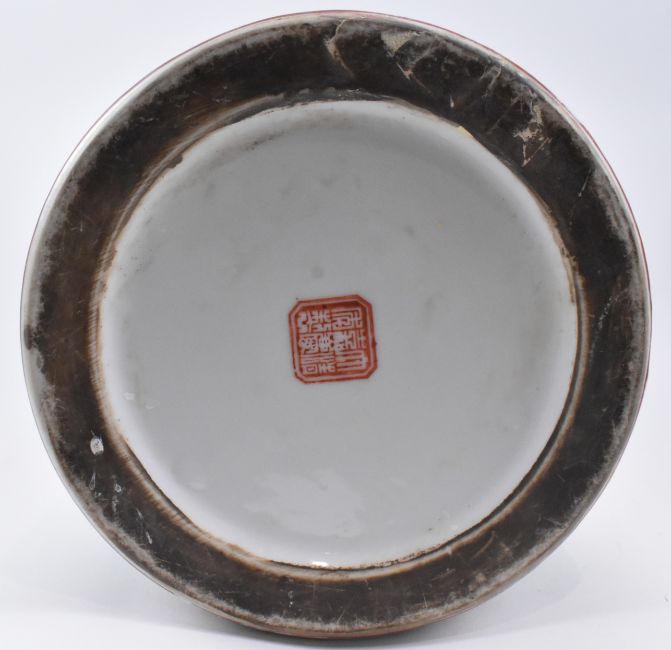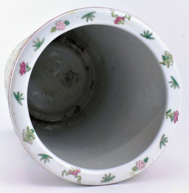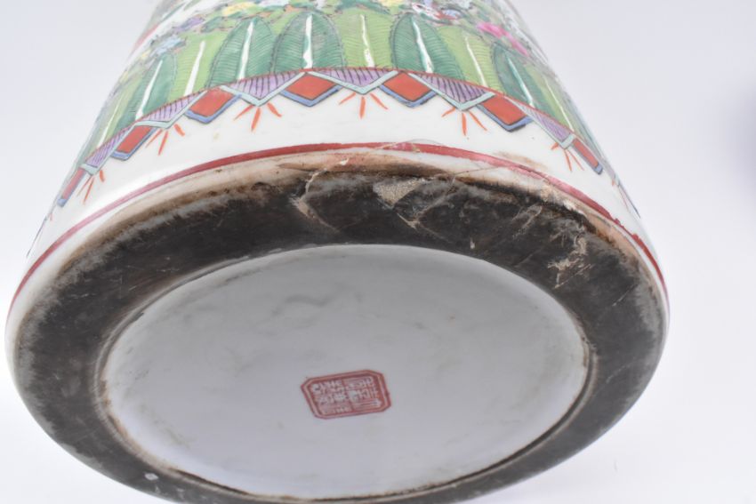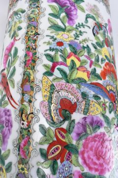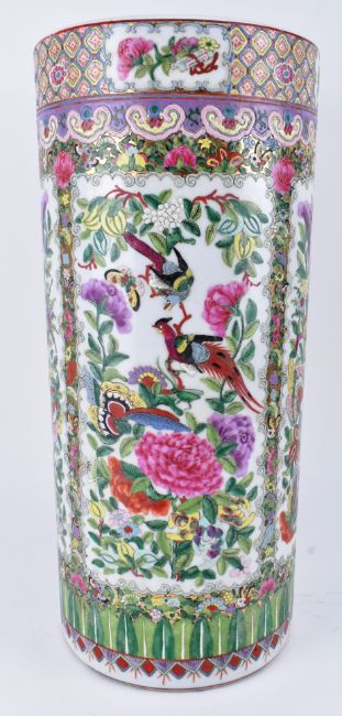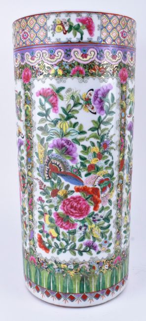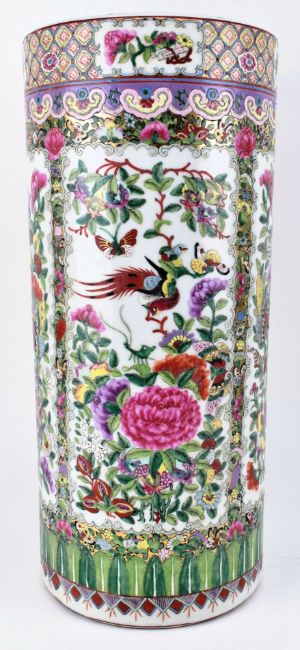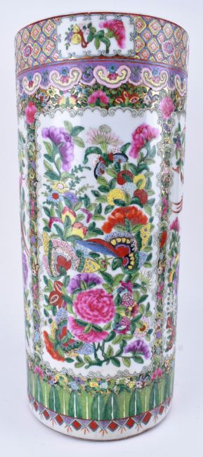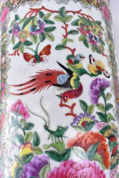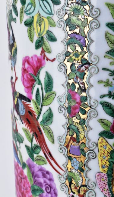 A Qing dynasty canton famille rose sleeve ceramic vase. The vase having a flat rim decorated with flowers and leaves, five open panels decorated with peonies, chrysanthemums, birds and butterflies, surrounded flowers and butterflies, band of lappets at the bottom. Six-character Jiaqing mark to the base.