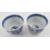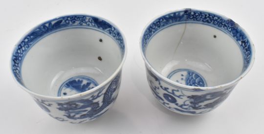 A pair of Qing dynasty blue and white porcelain cups. Each llettuce rim handled cup decorated with sea wave motifs with doube blue rings in the centre well, lotus and foliage scrolling under the rim to interior. Two four-clawed dragon chasing flaming pearls admist clouds to exterior. Four characters Kangxi marked to the base.