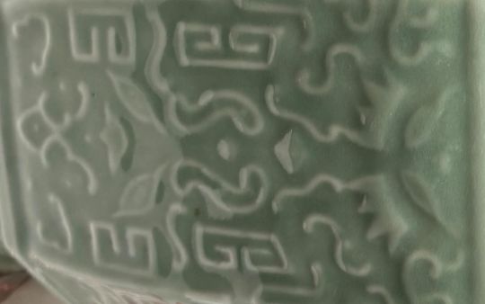 A large celadon octagonal vase. The octagonal section with a bulbous body, supported on a foot rising to a tall waisted neck and flared mouth rim, covered overall with a pale green celadon glaze, with relief dragons on the shoulder and on the body. Six-character Qianlong mark incised to the base.