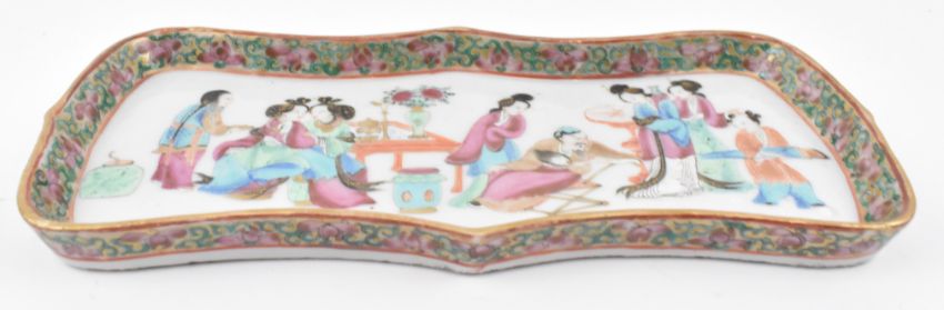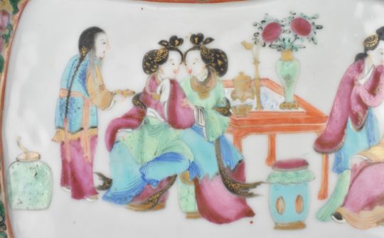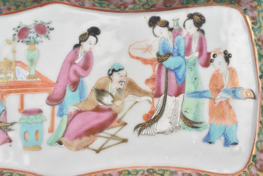 A Qing dynasty Canton famille rose ceramic tray. The finely painted tray has a lobed shape, foliage border and a scene of a family in the centre.