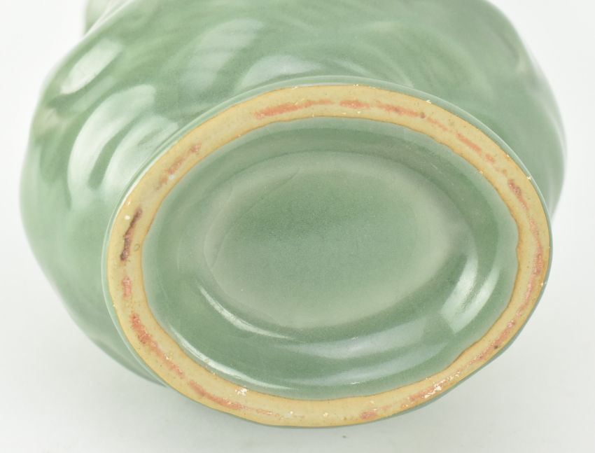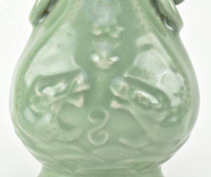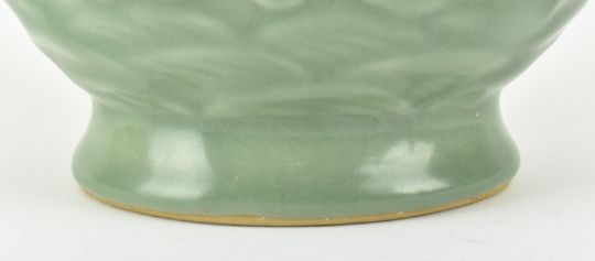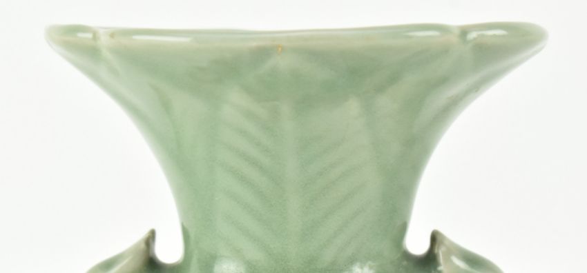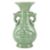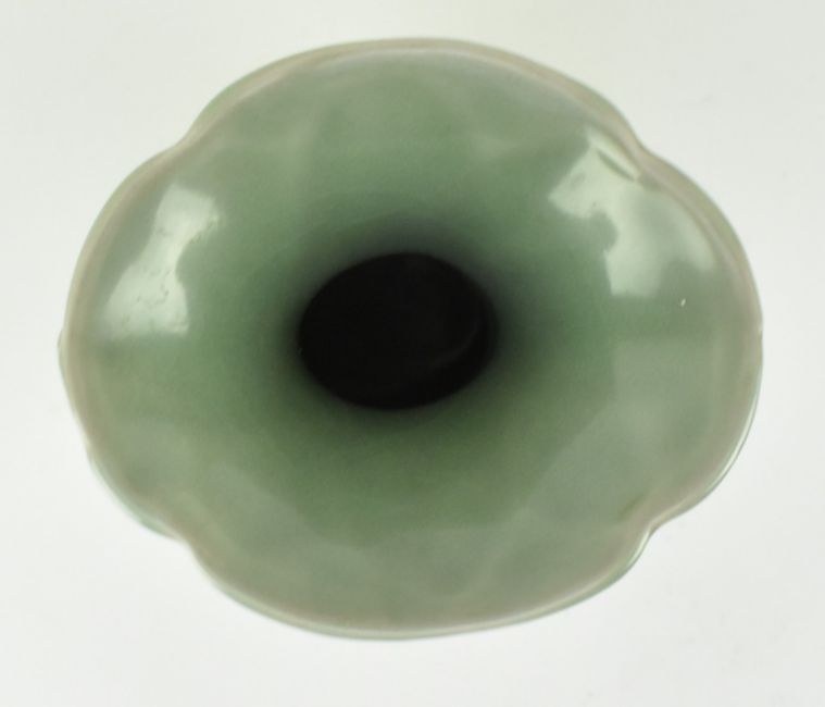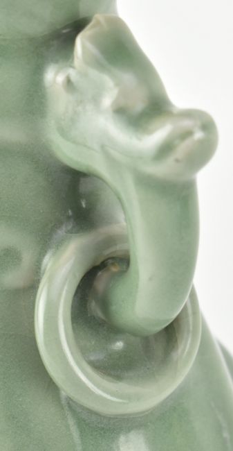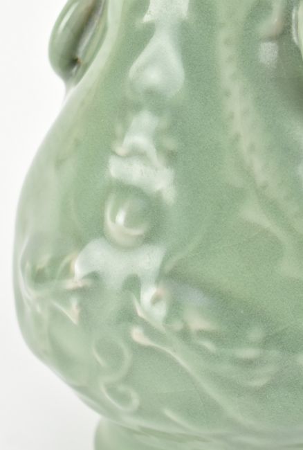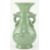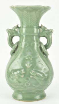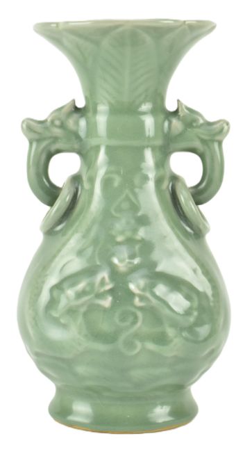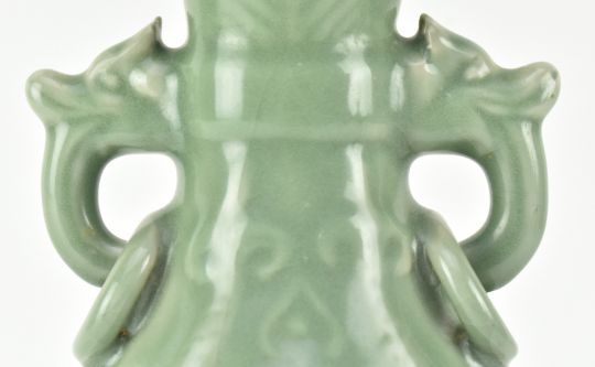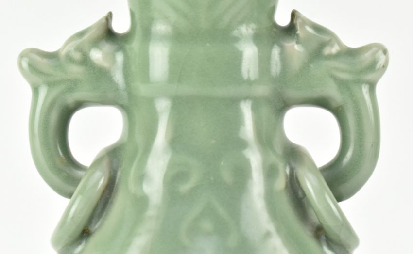 A Yuan or later celadon stoneware bronze shaped vase. The vase modelled in form of an ancient bronze vessel, bulbous body with lobed flared mouth, twin mythical beast handles with rings, relief double dragons motifs on the body, raised on a flared foot.
