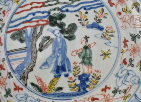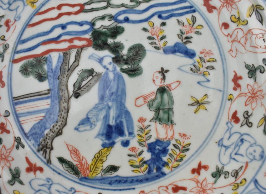 A Tianqi marked wucai porcelain charger dish. The circular dish decorated in underglaze blue featuring Further decorated with red and green enamels. Four character Tainqi mark to base in double circle.