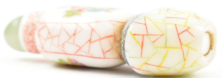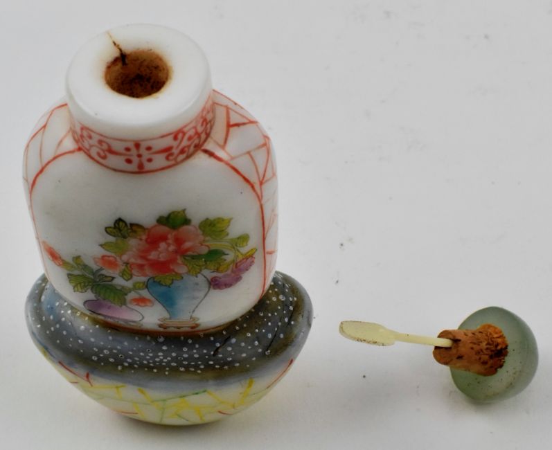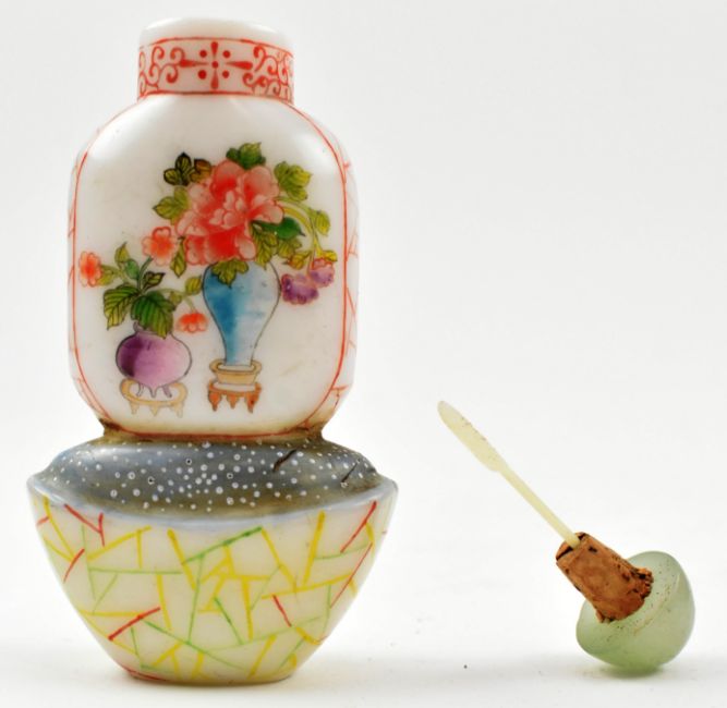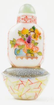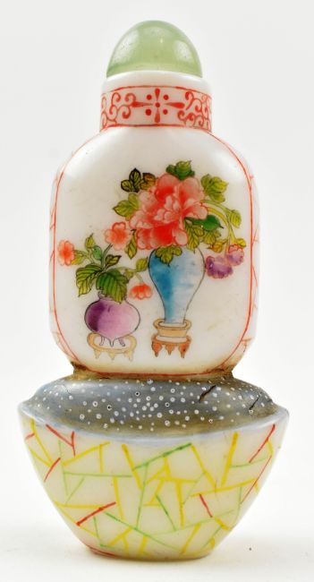 A 20th century glass snuff bottle with stopper. The square-shaped glass snuff bottle decorated with hand painted peonies on each side, foliage motif to the neck, geometric pattern to the side of the bottle, raised on a gold ingot-shaped base painted with geometric pattern.
