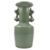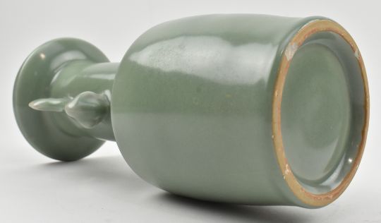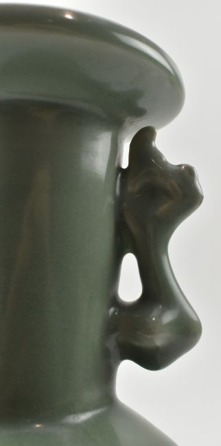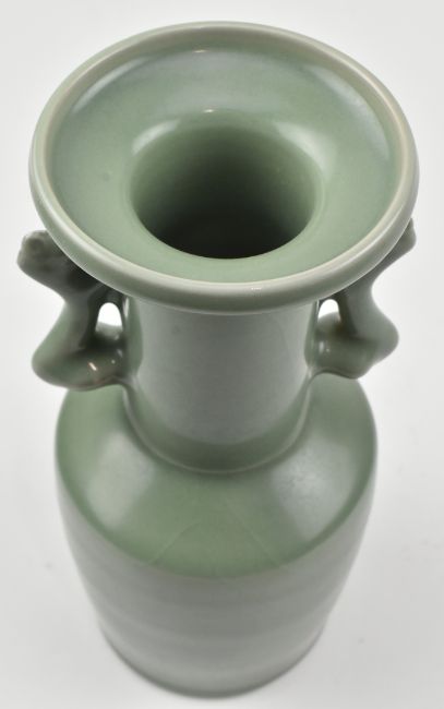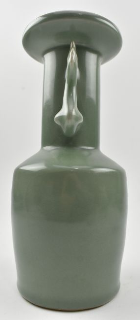 A Longquan celadon twin handled mallet ceramic vase. The tapering cylindrical body rising from a recessed base to an angled shoulder and tall cylindrical neck with a broad dished mouth, set at the neck with a pair of stylised phoenix handles and covered overall in a green glaze suffused with a network of crackles.