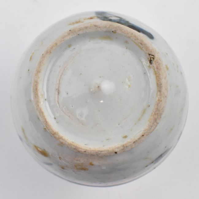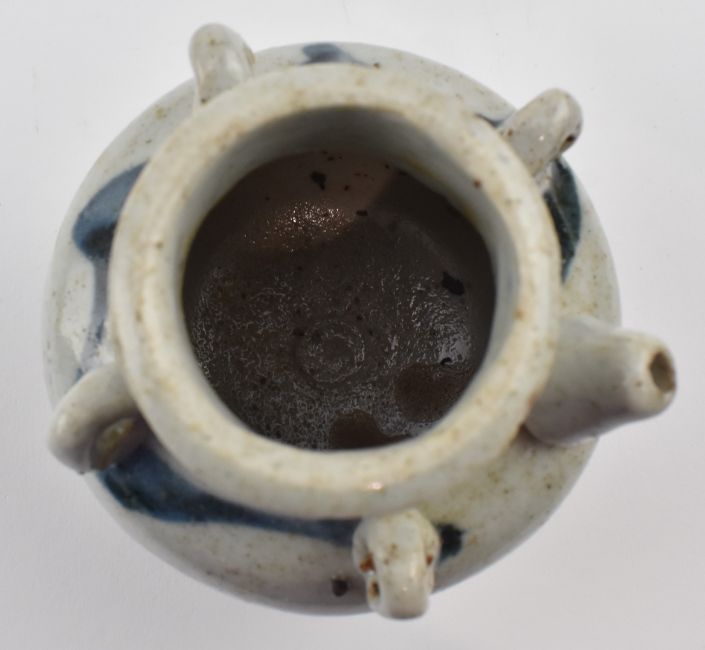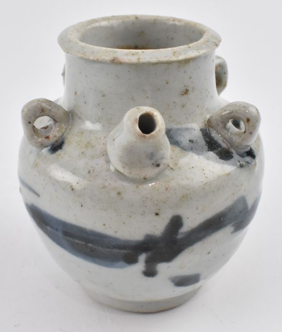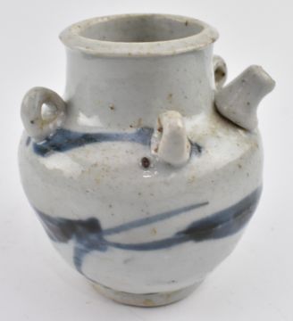 A small Ming dynasty blue and white stoneware wine ewer / water pot. The ewer / water pot / jar decorated with four loop handles, a spout ans abstract brushwork on the body.