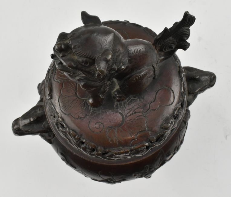 A large early 20th century Taisho period (1912-1926) bronze lidded censer. The censer modelled in a bulbous body form with broad mouth, relief flowers and birds on the body, two animal head handles raised on a 3 feet plinth. The lid decorated with openwork foliage pattern, engraved 'Hulu' gourd and leaf and a seated lion finial. Weight approx. 3400g.
