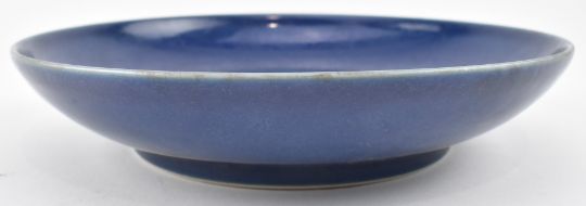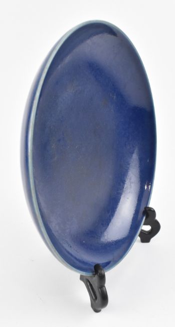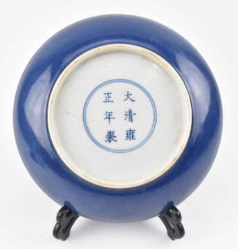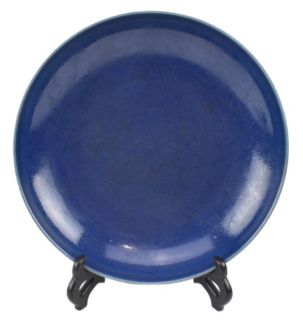 A Qing dynasty blue glazed porcelain charger plate. The circular decorated with blue monochrome glaze, with size character Yongzheng marked to the base.