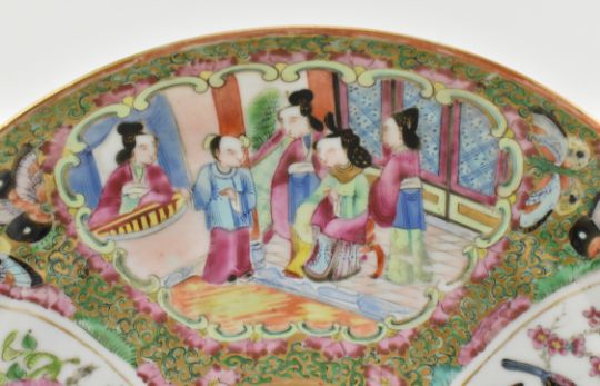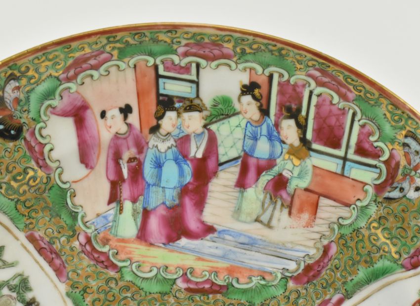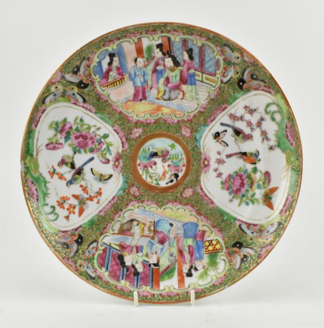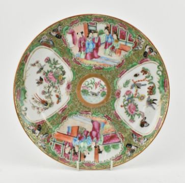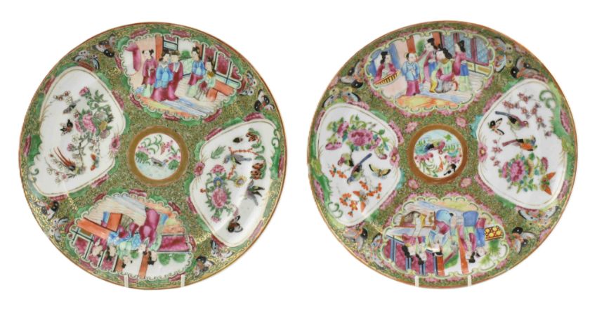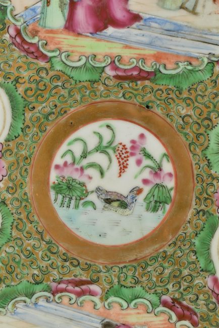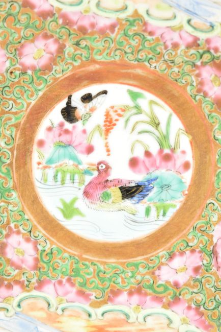 A pair of Qing dynasty Daohuang period Canton famille rose porcelain charger plates. The circular slight evered rim plates decorated with mandarin duck in the middle, four open panels of figurines & birds with flowers, surrounded by gilt lotus and foliage design.