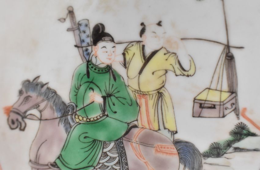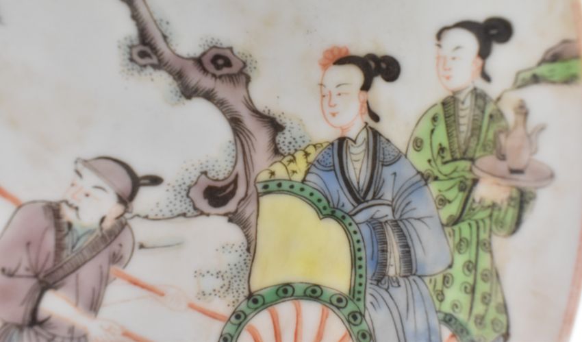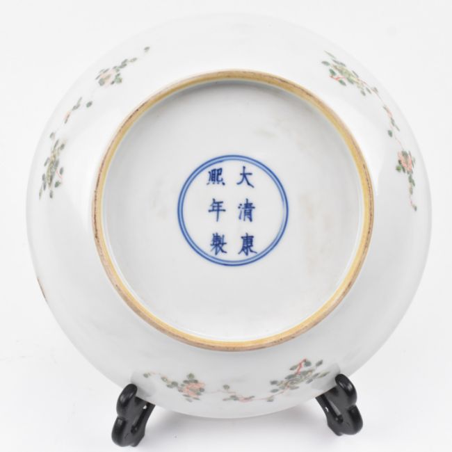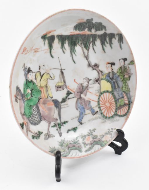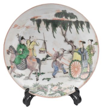 A Qing dynasty famille verte ceramic figurine charger plate. The circular plate decorated with figurines. Sprigs of flowers to exterior, six character Kangxi marked to the base.