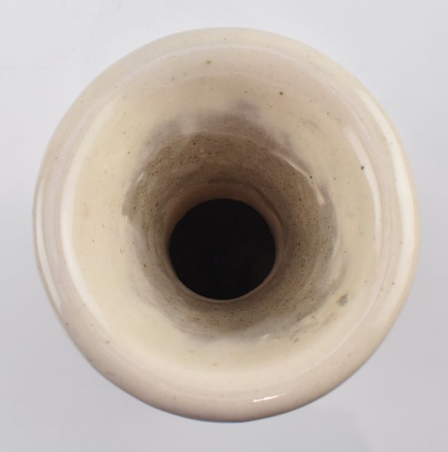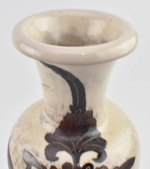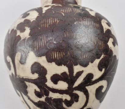 A Northern Song Cizhou white glazed pottery vase. Potted with lobed bulbous body rising to a trumpet neck with everted mouth, covered with a lustrous black-brown glaze thinning to a light ochre at the raised bands and stopping above the foot.