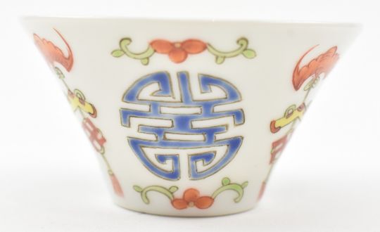 A Qing dynasty famille rose ' Buddhist Emblems' porcelain cup. a tapering base rising from a circular foot to an everted rim, painted with four of the Buddhist Emblems. Iron-red six-character Tongzhi marked to the base.