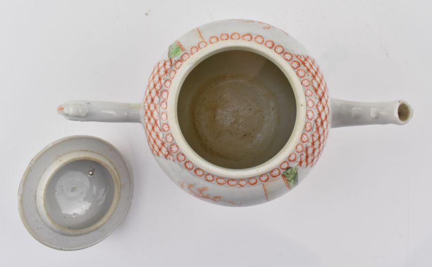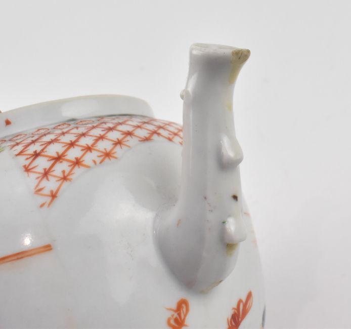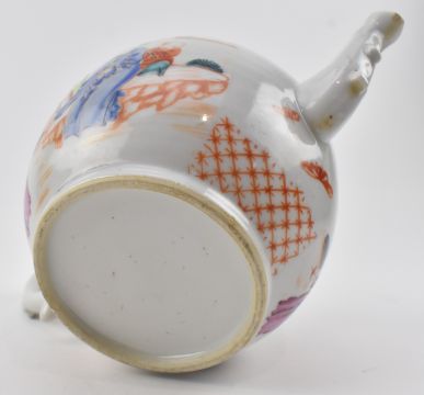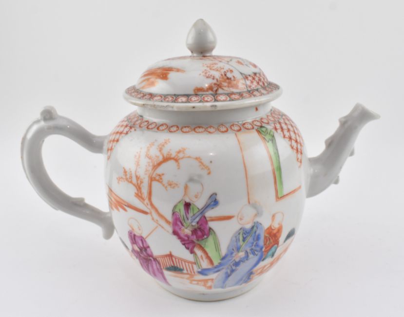 A Qing dynasty Qianlong famille rose porcelain teapot. The teapot of oval form with C-shaped handle decorated with a family gathering in the garden.