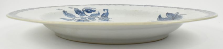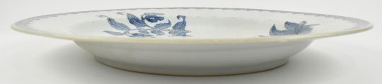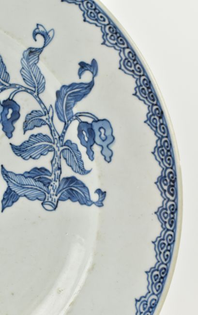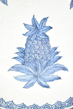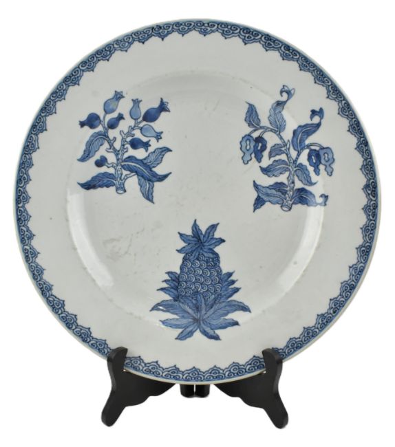 A Qing Qianlong period blue and white ceramic charger plate. The cicular everted charger plate decorated with guavas, loquats (medlars) and pineapples. Ruyi cloud scrolling to the edge.