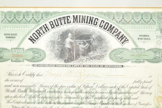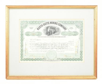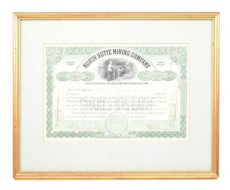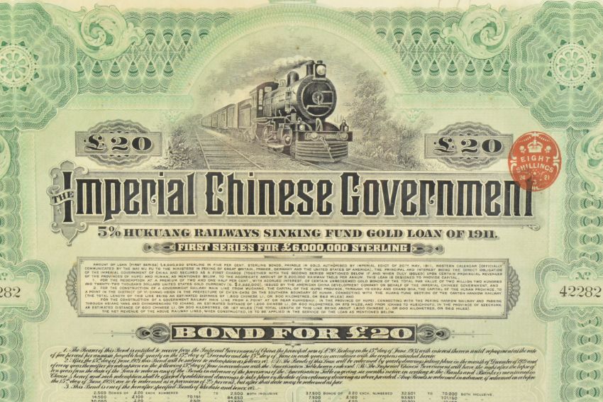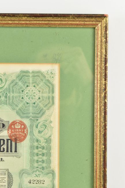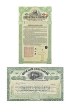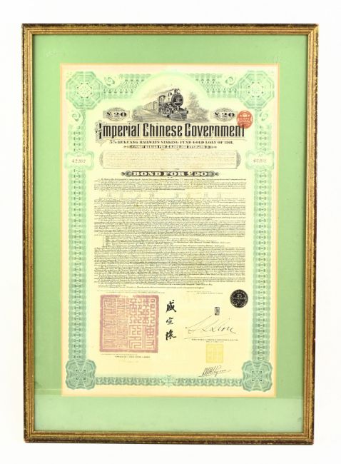 An early 20th century 1911 Imperial Chinese Government £20 5% Hukuang Railways 湖广铁道 sinking fund gold loan paper bond, coupons are attached. Framed & glazed. Together with a North Butte Mining Company 10 shares paper certificate bond from the State of Minnesota.