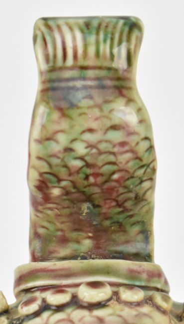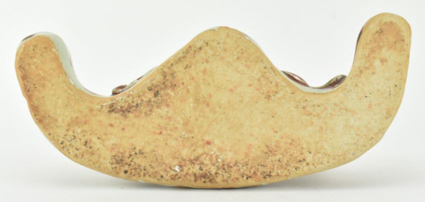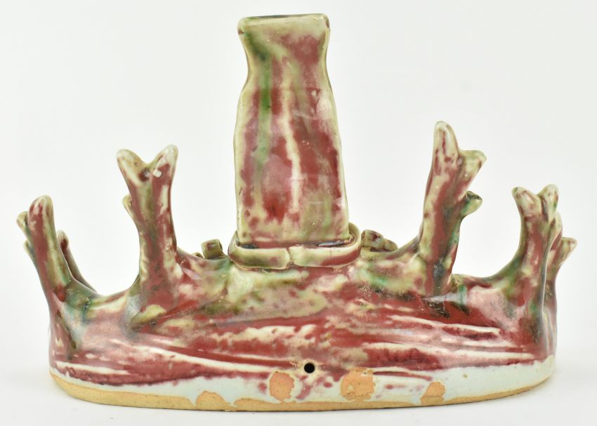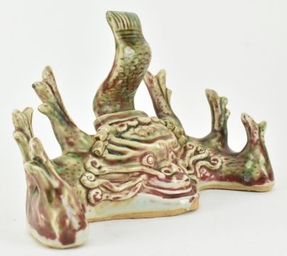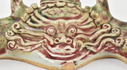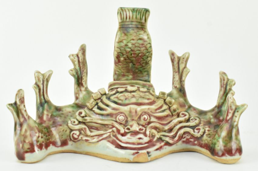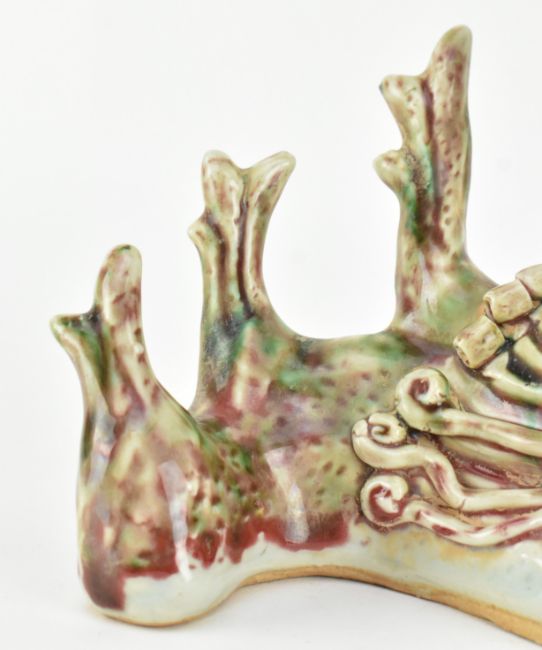 A flambe-glazed ceramic brush holder. The brusher holder modelled in form of a dragon, with fierce eyes, curls in head with horns.