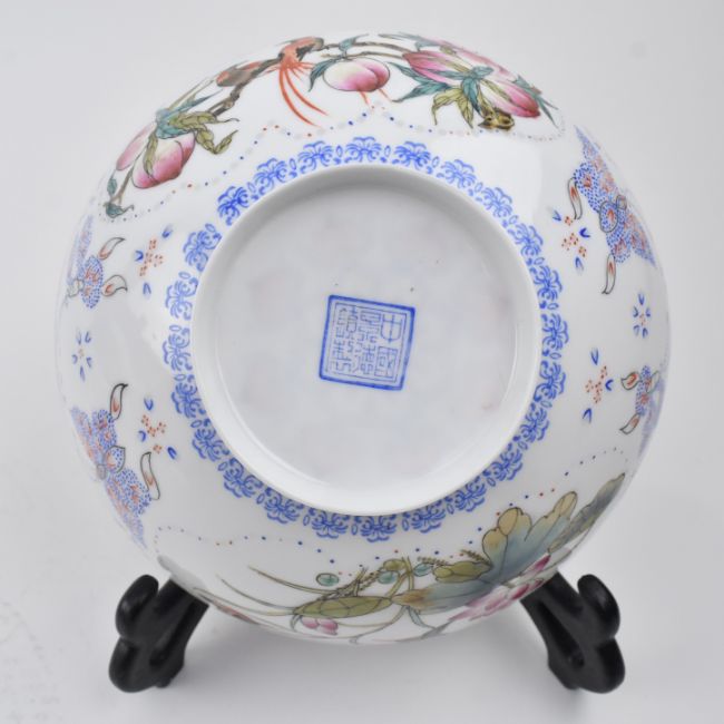 A 20th century eggshell porcelain footed bowl. The bowl decorated with peaches, lotus, butterflies interior. Matching design to the exterior.