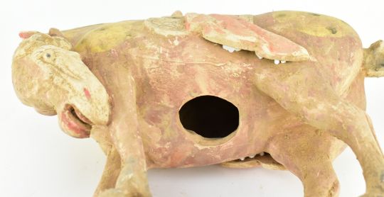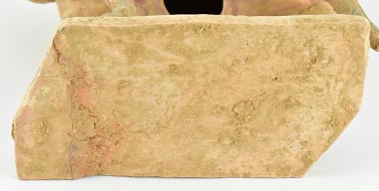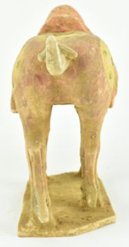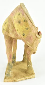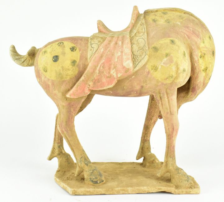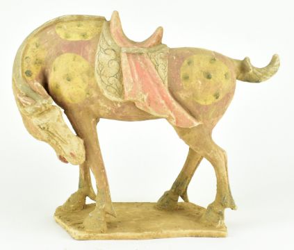 A Tang dynasty straw-glazed pottery figure of a horse. The horse painted with red ground with yellow medallion and black dots, standing four-square on a flat rectangular base with the head turned low to the left front leg. Red saddle cloth all finely detailed in red and black.