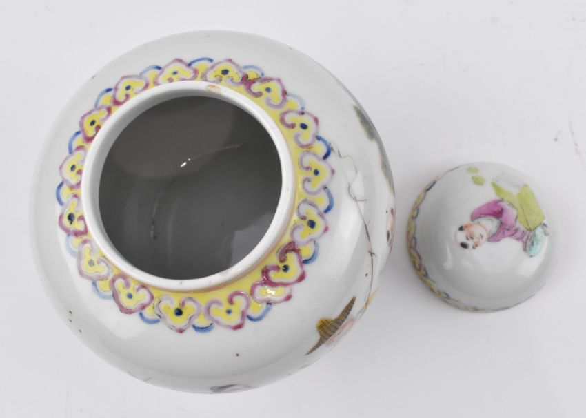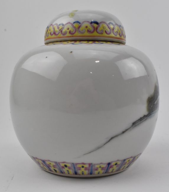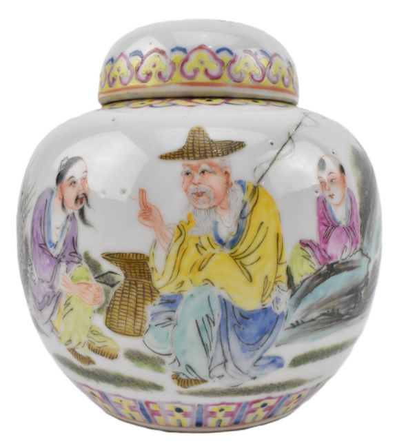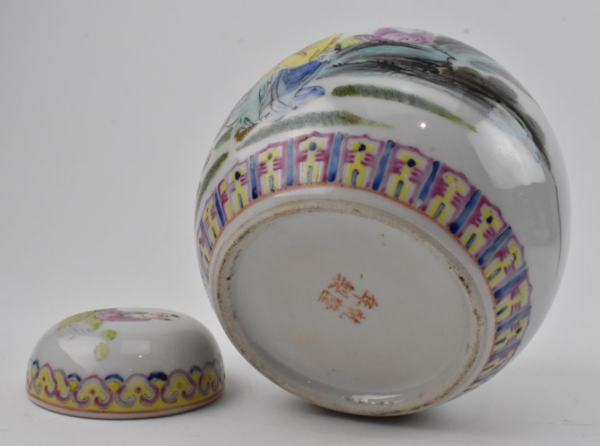 A Republic period famille rose porcelain ginger jar. The ovoid-shaped lidded jar decorated with ruyi clouds to the neck, figurines by the river, lappet scrolling to the bottom. Qianlong marked to the base.