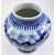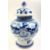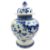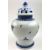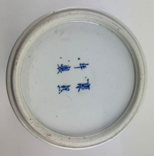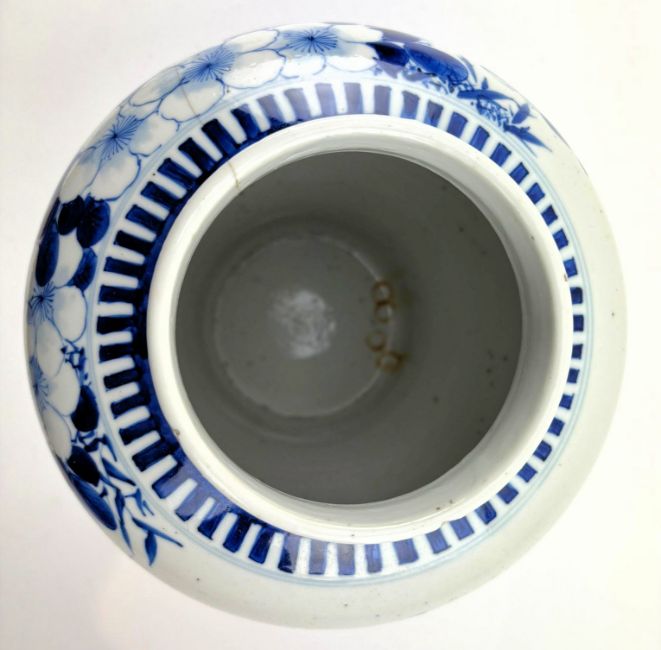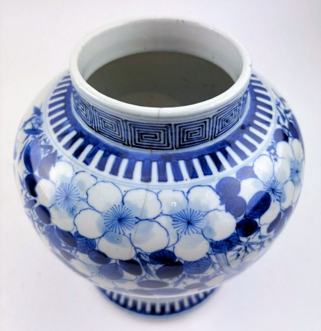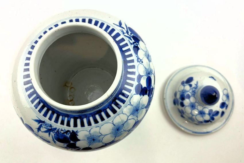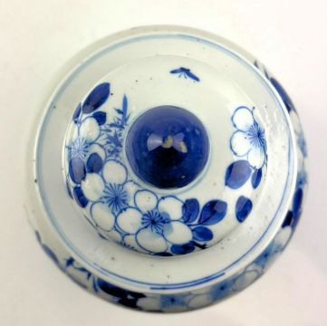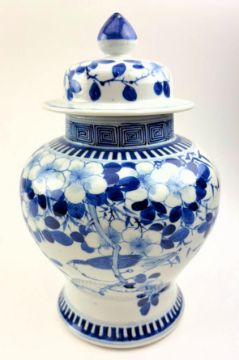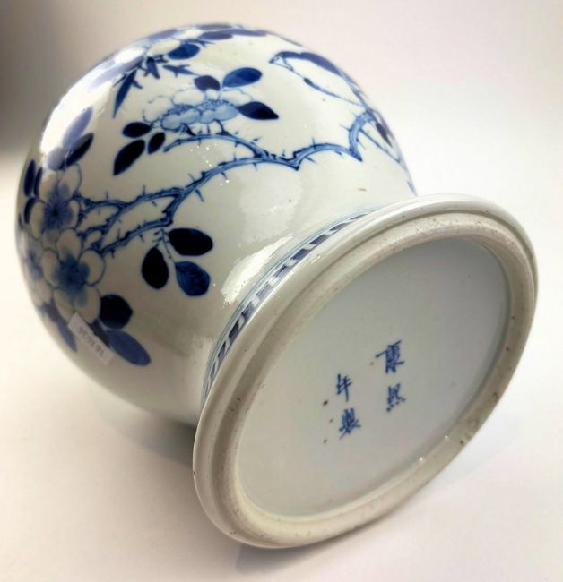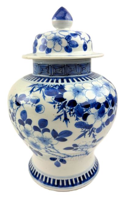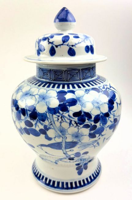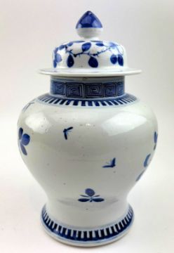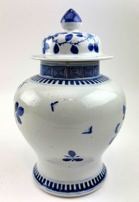 A Qing dynasty blue and white porcelain jar. The baluster lidded jar decorated with fret motif under the mouth rim, leafy flowers, bamboo leaves, bird and butterflies to the body, geometric scrolling to the bottom. Four characters Kangxi marks to the base.