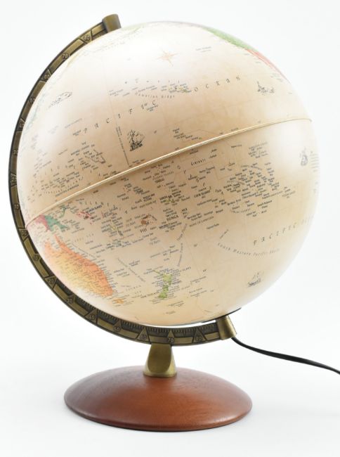 Nova Rico - a retro late 20th Century Italian desk / table top terrestrial globe / lamp. The globe having a brass effect plastic mount with all raised upon a circular teak base. PAT tested.
