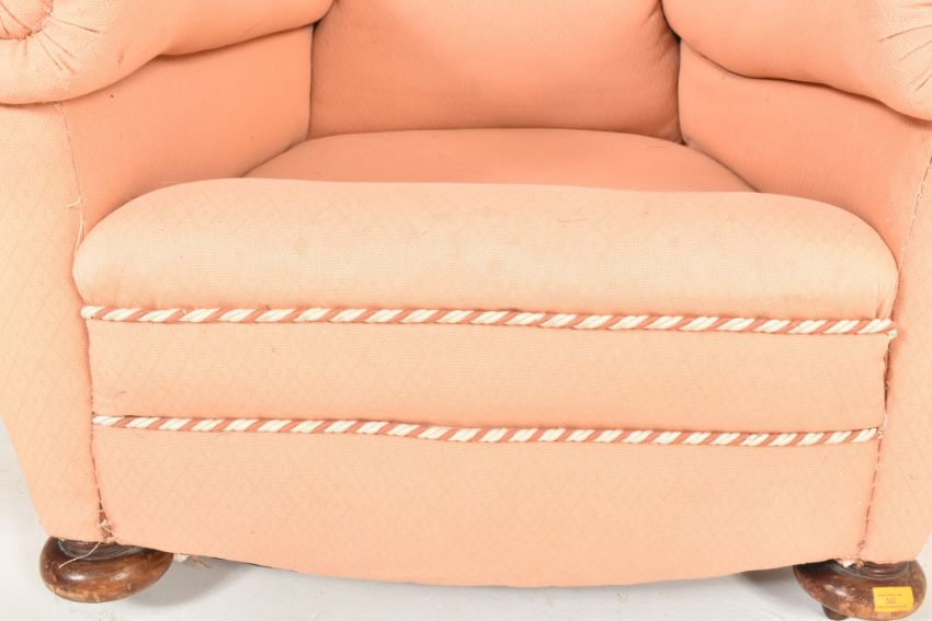 An early 20th century club armchair. The chair having a padded backrest and cushioned seat with thick scrolled armrests. All raised on bun feet supports finished in pink upholstery.