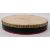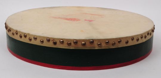 Late 20th century leather skin hand drum, with brass nailed edge and wooden framed painted green and red with gilt detailing to the wooden cross handle reverse. Surface of the drum depicts a hand painted harp with the artists signature below 'T. Collins'. Measuring approx. 46cm x 46cm x 7.5cm.