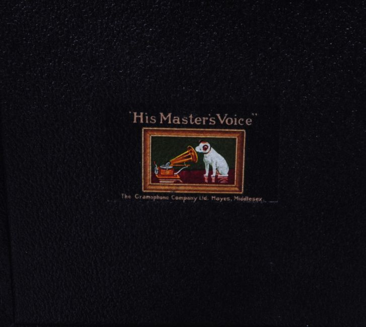 A vintage early to mid 20th century His Master's Voice HMV portable wind up gramophone record player. Turntable to the interior housed within a black leather case. Measuring approx. 16cm x 41cm x 28cm.