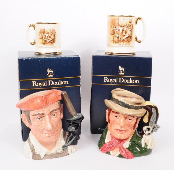 Collection of mid to late 20th century ceramic tankards and jugs. Comprised of two Arthur Wood gilt decorated tankards, a Royal Doulton Bill Sikes D6981 limited edition character jug no. 0063 out of 2500, and a Royal Doulton Blacksmith D6571 character jug. Character jugs housed within their original boxes, measuring approx. 25cm x 18cm x 15cm, including the box.