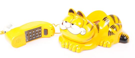 Garfield - A vintage 20th century TeleConcept garfield landline telephone. The phone in bright orange colourway, with black stripes, in the form of Garfield the cat. Eyes open when phone removed from holder.