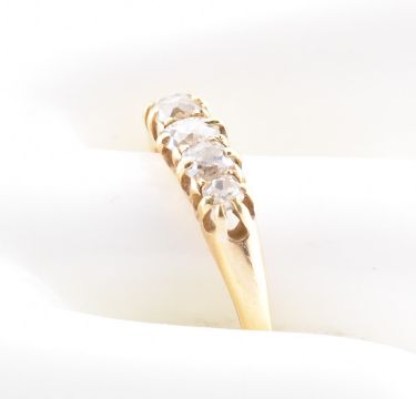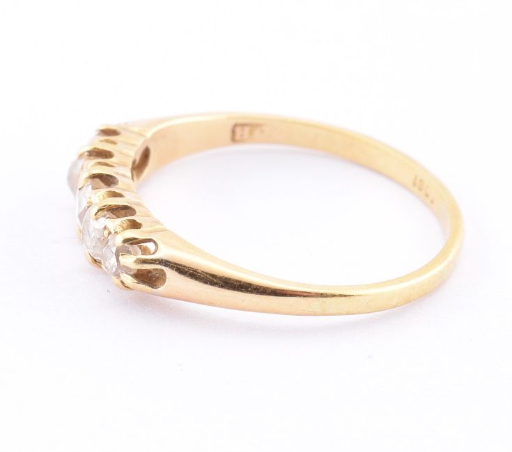 18ct gold five stone diamond ring. The ring having five graduating old cut diamonds to tapering shank. Marked 18, makers mark partially visble, for H. Size S. Weight 3 g. All sizes, weights and measurements are approximate.