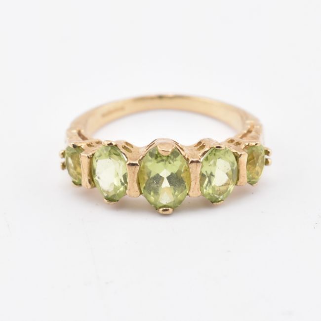 A hallmarked 9ct gold and peridot five stone ring. The 9ct yellow gold ring set with five graduating oval cut peridots with decorative shoulders to tapering shank. Hallmarked with import mark for Birmingham. Size L.5. Weighs 2.9g. All weights, measurements and sizes.
