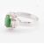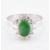An 18ct white gold jade and diamond halo ring. The 18ct white gold ring set with a central oval jade cabochon having baguette cut diamond shoulders and framed by round brilliant cut diamonds. Marked 750 and 18K to inner shank. Size N. Weighs 4.1g. All weights, measurements and sizes are approximate.