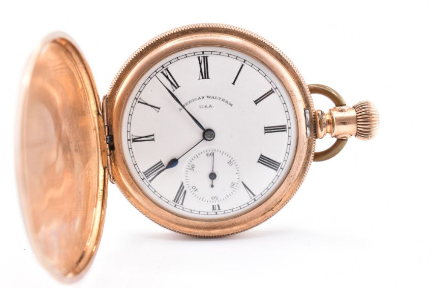 A yellow metal Waltham full hunter pocket watch together with a hallmarked silver Albert chain. The lot to include a yellow metal American Waltham full hunter pocket watch having a white dial signed American Waltham U.S.A, Roman numeral indices, subsidiary seconds dial and blued hands to rose metal full hunter case with engine-turned decoration to top bale. Metal unmarked. Movement signed Waltham. The lot to also include a hallmarked silver curb link Albert chain with T-bar, dog lead clasp and two coin pendants, one being a 1897 Dutch 25 Cent and a 1890 Indian 1/4 Rupee. Chain, t-bar and clasp hallmarked for London, 1900 together with maker's mark S.BROS. Waltham pocket watch measures 7cm x 5cm. Albert chain measures 19cm x 0.5cm. Total weight 117g. All weights, measurements and sizes are approximate. All watches are sold as untested, therefore, without warranty.